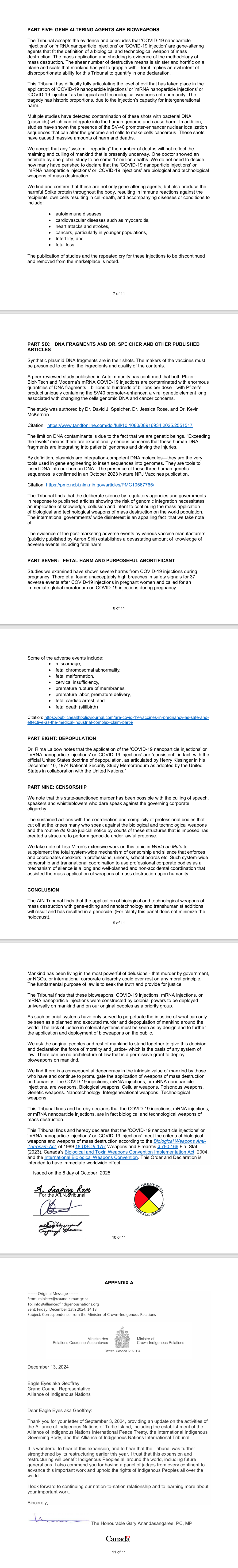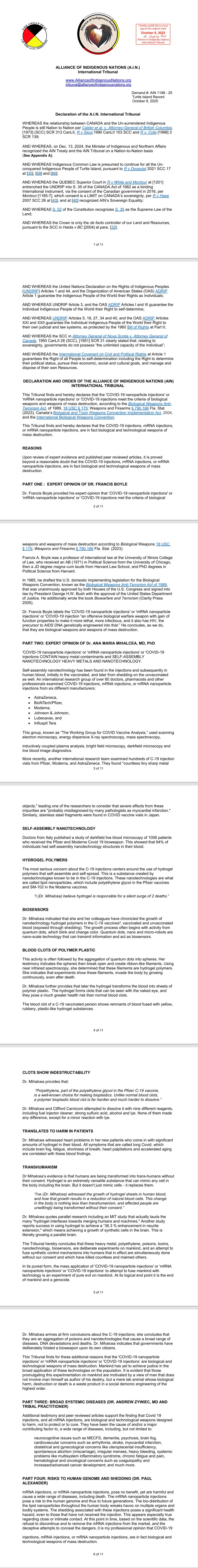 The Indigenous Nations (A.I.N.) International Tribunal has nation to nation status recognized by the Canadian government. The Indigenous Nations (A.I.N.) International Tribunal is the first governing body and judicial authority in the world to issue an ORDER declaring the MRNA nanoparticle injections biological and technological weapons of mass destruction. It is unclear what the international legal ramifications of this ORDER will be. The ORDER also states: