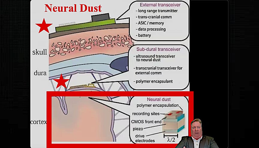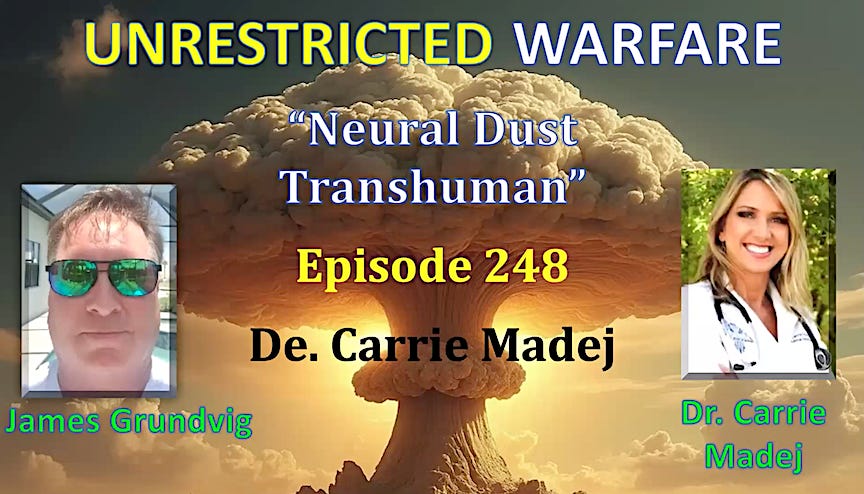 (‘Dr Carrie Madej: Neural Dust Transhuman – Unrestricted Warfare with James Grundvig’ Running Time 62 mins – Pub. Mar 6, 2025 on ForbiddenKnowledgeTV.net)(PLEASE GO HERE TO SEE VIDEO/ READ ENTIRE ARTICLE AND TRANSCRIPT, IF CUT OFF IN YOUR EMAIL! THIS SUBSTACK POST IS A REDACTED VERSION THAT MAY BE CUT-OFF, AS WELL) Dr Carrie Madej was an Internal Medicine Specialist in Georgia with 20 years in practice when she began to speak out against the lockdowns and the forced injections during the COVID PSYOP. Then, she ended-up in a plane crash and she was severely injured. She kept speaking up after that but then, she took some time off. Now, she’s back with James Grundvig in one of the final episodes of his podcast, Unrestricted Warfare to talk about Neural Dust and the DARPA’s work to connect pilots, soldiers, jet fighters, submarines, missile defense systems, etc with a Brain-Computer Interface, which she describes as, “Skynet from ‘Terminator’, period…They literally want to make every shooter connected to every biosensor. And guess what? Biosensors are in every human, right now, unfortunately. They want to supersede any sort of jurisdiction, meaning there is no jurisdiction. It’s all one.” Moreover, there is zero consent being offered for any of this, which are basic Human Rights violations and Crimes Against Humanity. The main reason why she chose to put herself out there was because she had attended some meetings, back in 2013 and ’14, where people talked about their intention of using this self-assembling nano technology, purely to control and to spy-on people for predictive Predictive Policing. As she tells James, here, “This was not about the health and well-being of anybody. So, and if you look at all the research out there and you look at what governments are saying, you know, Klaus Schwab, ‘It’ll change who you are.’ That’s what he says! “And so, we have to look at who’s behind the programming? Who’s doing this? Technology’s not bad, but you have to learn that it’s a tool and it’s in the hands of those that do not have goodwill for humanity, at all. So this is why we should put a moratorium on all of this, right now, before going forward. Plus, where’s the consent? I see no consent with any of this, right now.” The other reason she has come forward, to the detriment of her career and of possible threats to her life is that she is a very devout Christian and because she believes that our enemy is not just diabolical but literally Satan and demonic entities and that humanity does not posses any other technology to combat the genocidal attacks of the Globalists, besides faith in God – or better yet, Salvation by Jesus Christ. If her Christian pronouncements bug you, get over it, move past it and read on. Dr Madej is an extremely intelligent woman and an extraordinary human being and this is very important information! TRANSCRIPT Dr Carrie Madej: This is “Skynet” from ‘Terminator’, period. And it’s real time, right now. It’s not just a fairy tale. They literally want to make every shooter [war fighter] connected to every biosensor. And guess what? Biosensors are in every human, right now, unfortunately. They want to supersede any sort of jurisdiction, meaning there is no jurisdiction. It’s all one… They link social media into this. Isn’t that crazy? So, they actually admit they have social media in there and they say it’s the “human domain: leaders sow doubt and organizations, dilemmas, population, multiple narratives.” Well, it sounds like they’re sowing discord to cause strife and for control. And for their “Domain Operations Objectives: gain access, control timing and effects and exploit interdependencies.” I don’t think this is for the health and wellbeing of everybody! And this is connected to – this is a Skynet, which is this is JADC2. This is Stargate. Everything, all at once… James Grundvig: This is an image from Neural Dust. So: skull, dura, cortex. We’ve got three layers…Those are microchips, whatever you want to call them. Those are implants into the brain, into different parts of the brain.