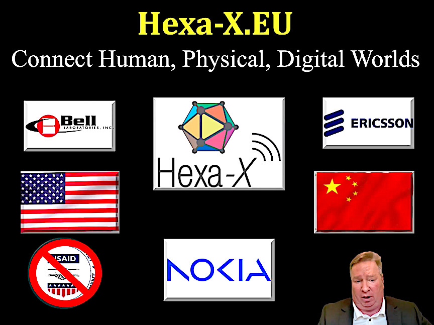 James Grundvig: Hexa-X officially launched in 2021, but actually has been around since 2015, at least, under different names and different EU country projects. So, it’s 6G at the center. Twinning and Control, Digital Twins. Cognition and synced bio. So they want to take your biology and your brain waves and sync it up to the brain-computer interface. Physical world. Real-time control. Control of who, right? And the human world. They want control of all of this. Now, what’s interesting for you, audience, you want to go educate yourself. I’m giving you the website in Europe. Hexa-x.eu. No excuse not to research this. You want to know what’s coming down the pike. I’m telling you what’s coming down the pike. And their tagline is connect humans. Their vision is to connect humans, physical and digital worlds all together for a wonderful trip to the park. This is their view. They want to connect it all, which means they want to control it all.
