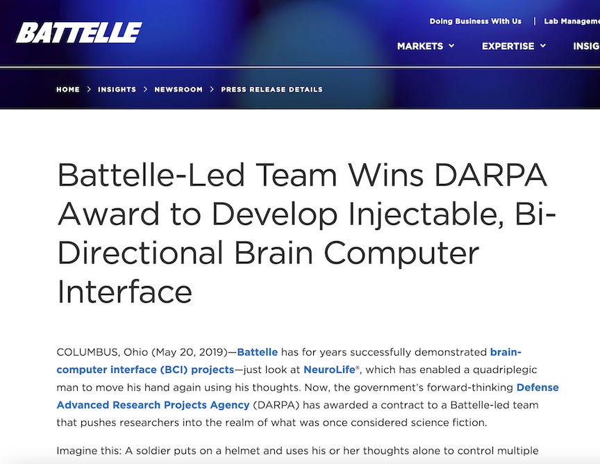 James Grundvig: Here we go again. Dr Carrie Madej: The hydrogel, you’re going to find hydrogel – they’ll try to mask its name. But that is, to me, I believe it’s Fallen Angel technology, because, even if you look at the research papers, these guys don’t know how it really works. They don’t even tell you how they got it. So, this is like a toddler with an atomic bomb in his hands. They have this technology without the wisdom or knowledge that should accompany it. And so, this really is, to me, the issue. One of the biggest issues. So, if we could get rid of the, like you said, the 5G, the 6G, these abnormal wavelengths going out. And hydrogel, I say those are the two biggest factors; to knock these things out. But it’s crazy, when you read this stuff. James Grundvig: It’s totally crazy. And we have no say in the matter. We’re not even informed. Dr Carrie Madej: Exactly. James Grundvig: “Battelle-led team wins DARPA award to develop injectable biodirectional brain-computer interface”. Oh, this sounds lovely.