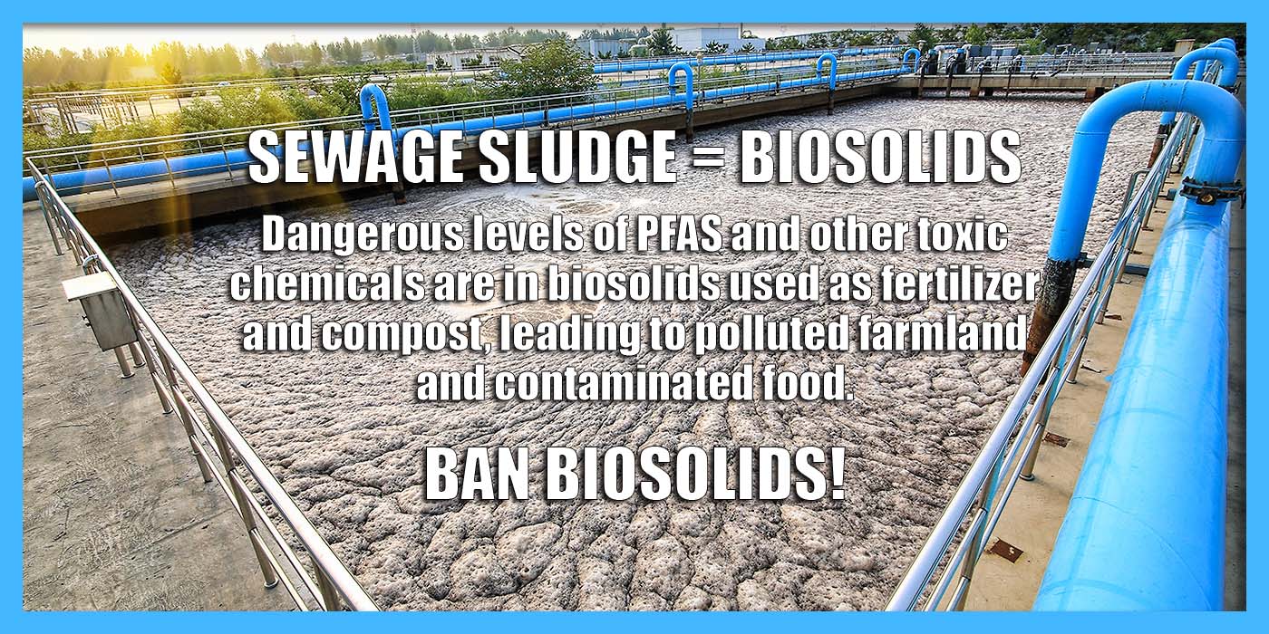 But biosolids aren’t just rich in nutrients. Biosolids can contain high levels of toxic PFAS “Forever Chemicals” (perfluoroalkyl and polyfluoroalkyl substances) that aren’t removed during the waste treatment process. And neither are the phthalates, pesticides, PCBs, antibiotics and other pharmaceuticals, microplastics, heavy metals, and innumerable other harmful substances that have been found in biosolids.